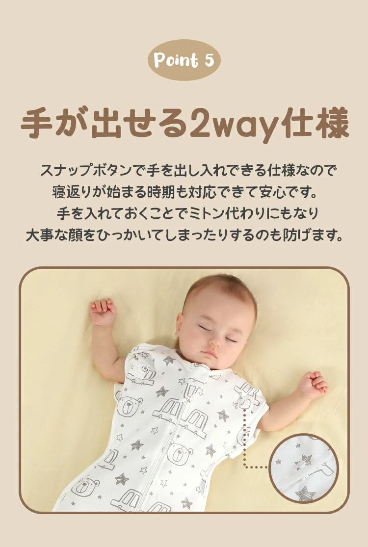 - 大事な顔をひっかいてしまうのを防げ、寝返りが始まる時期にも対応。