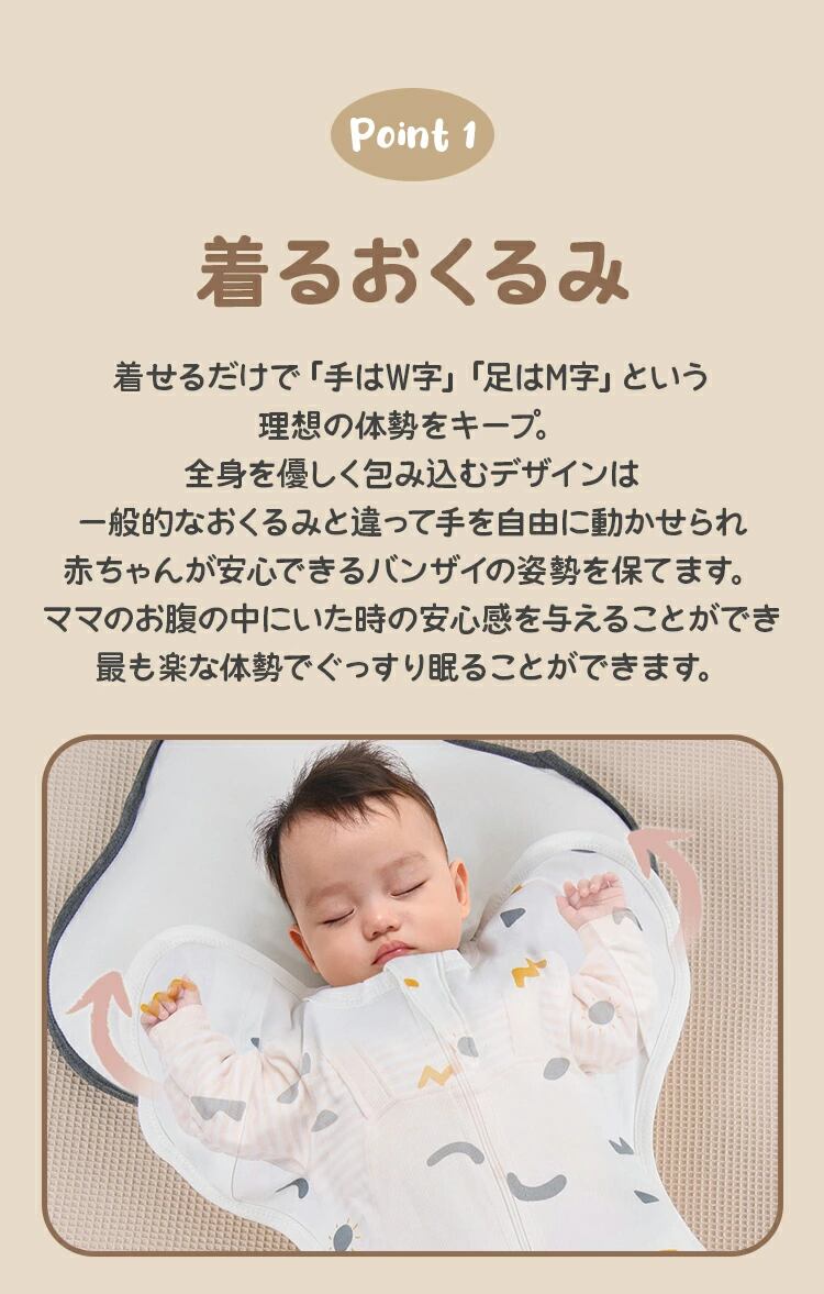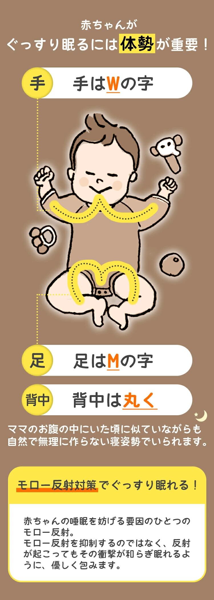 - 着せるだけで「手はW字」「足はM字」という理想の体勢をキープできる、着るおくるみです。