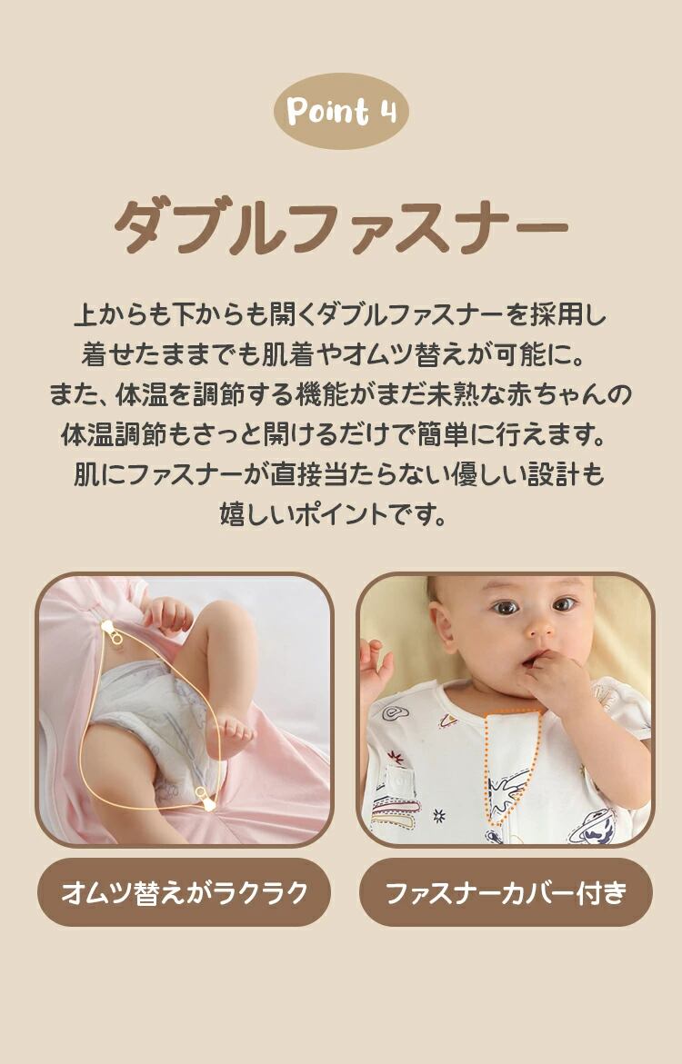 - 上からも下からも開くダブルファスナーを採用し、着せたままでもオムツ替えが可能。