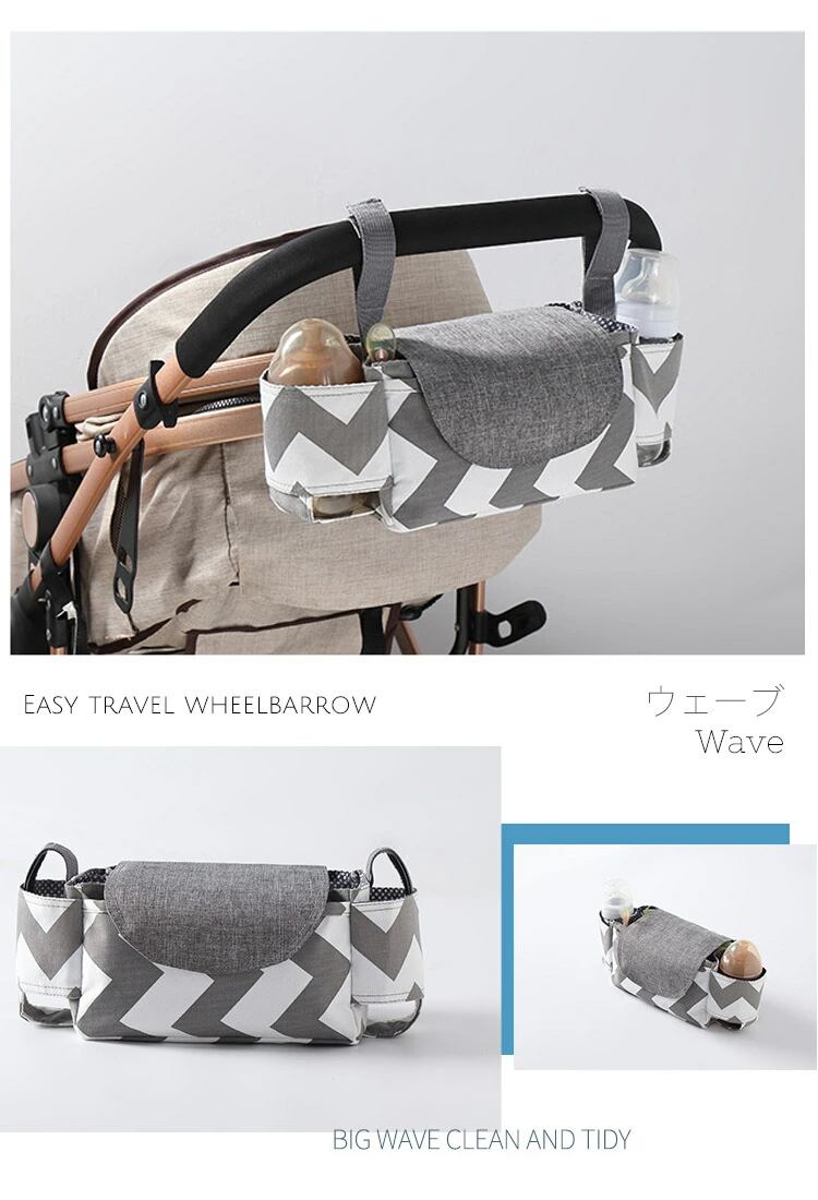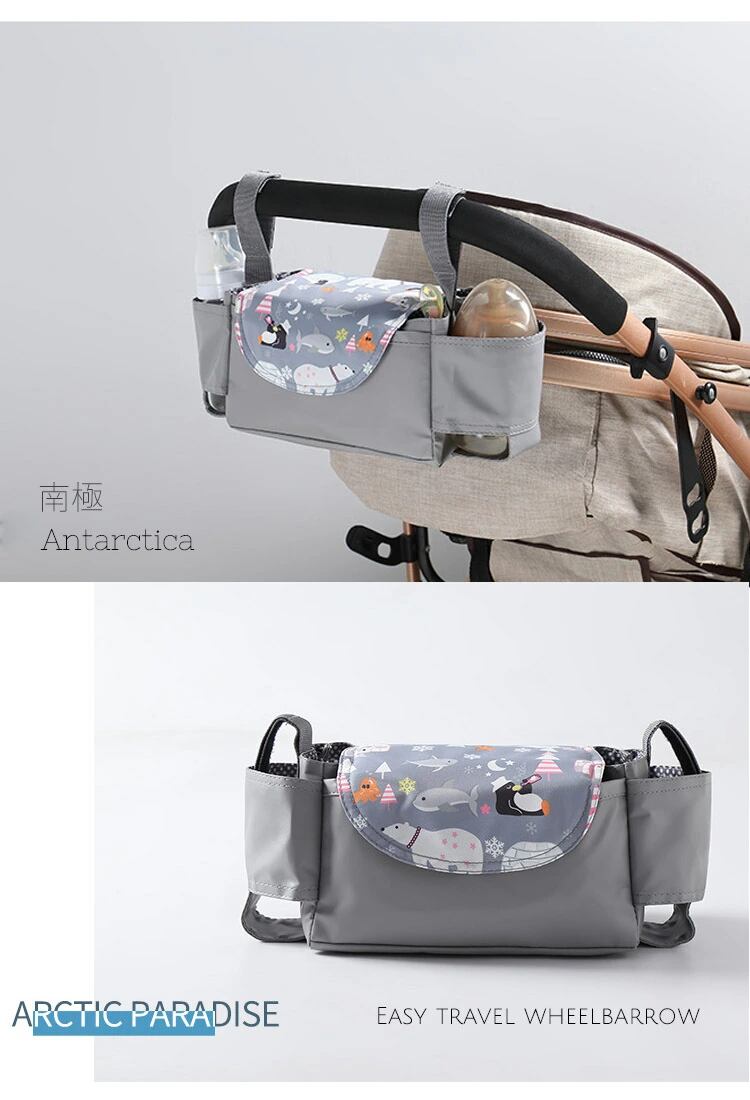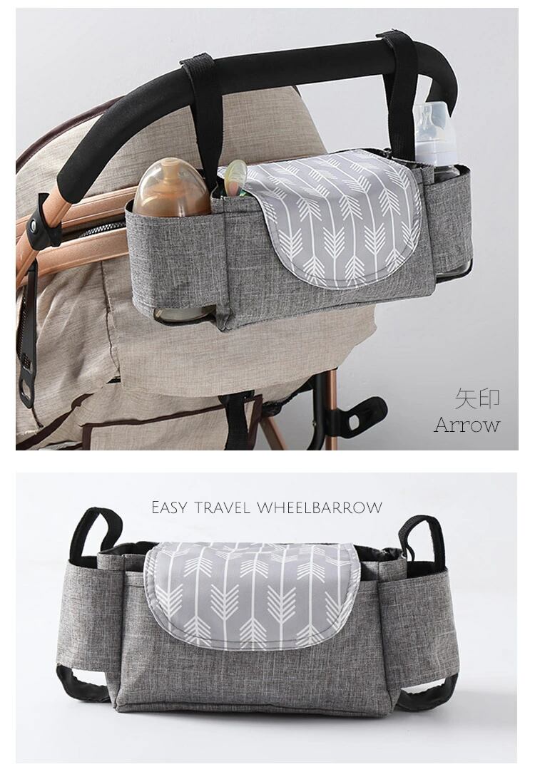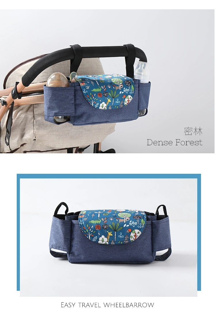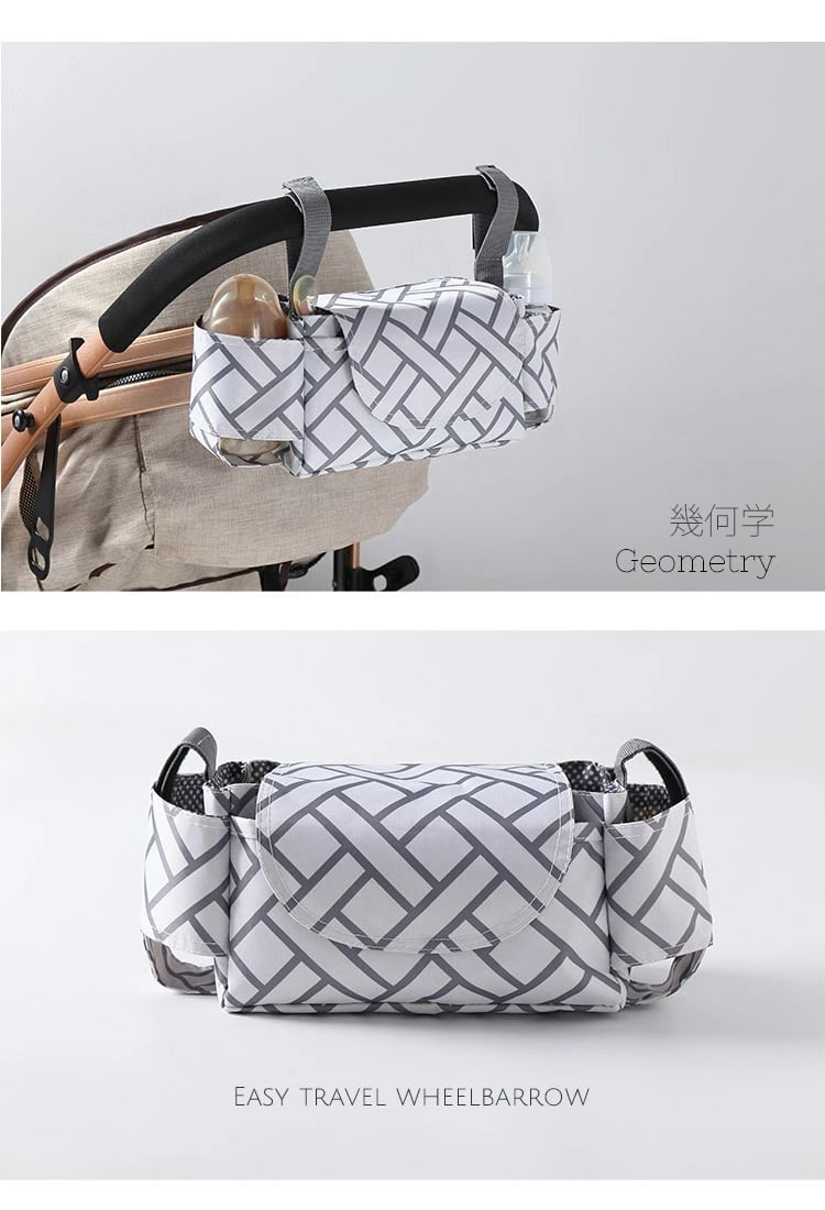 ベビーカーに取り付け可能な便利なバックです。赤ちゃん用のおもちゃ、シッピーカップ、哺乳びん、おむつに加え、携帯電話、鍵、飲み物、お菓子など、様々な物を収納することができます。