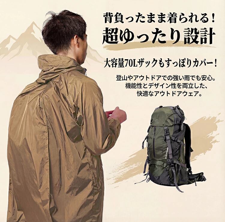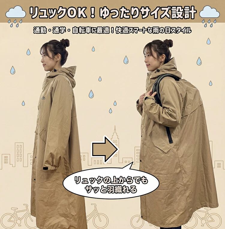 - リュックを背負ったまま着られるゆったり設計で、雨の日の移動をスマートにサポートします。