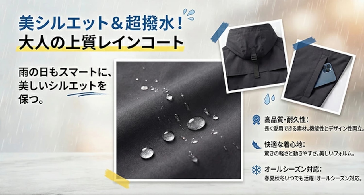 - 徹底防水と透湿素材で雨をしっかり防ぎつつムレにくい、通勤・通学・自転車に最適なロングレインコートです。