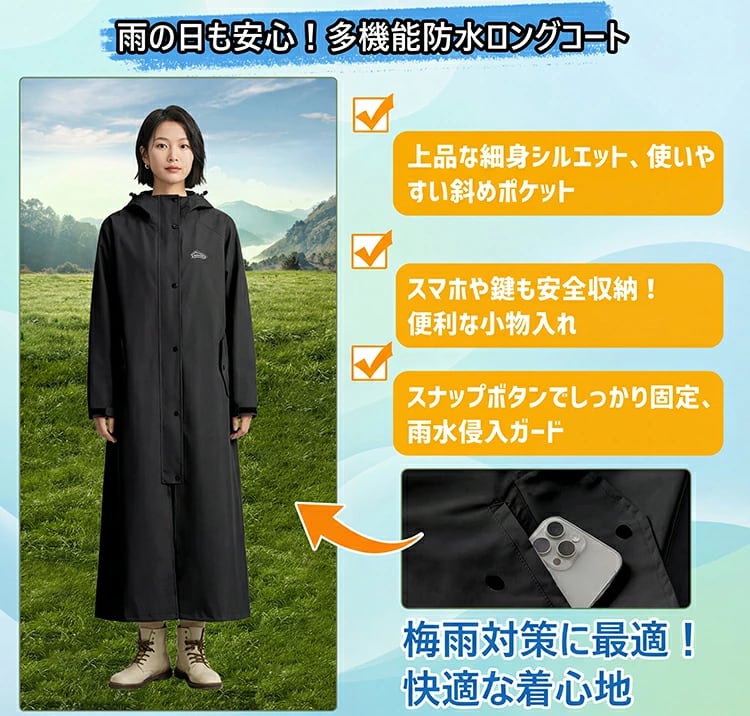 - フード調整・二重ジッパー・スナップ留めで、悪天候でも安心の高機能レインロングコートです。